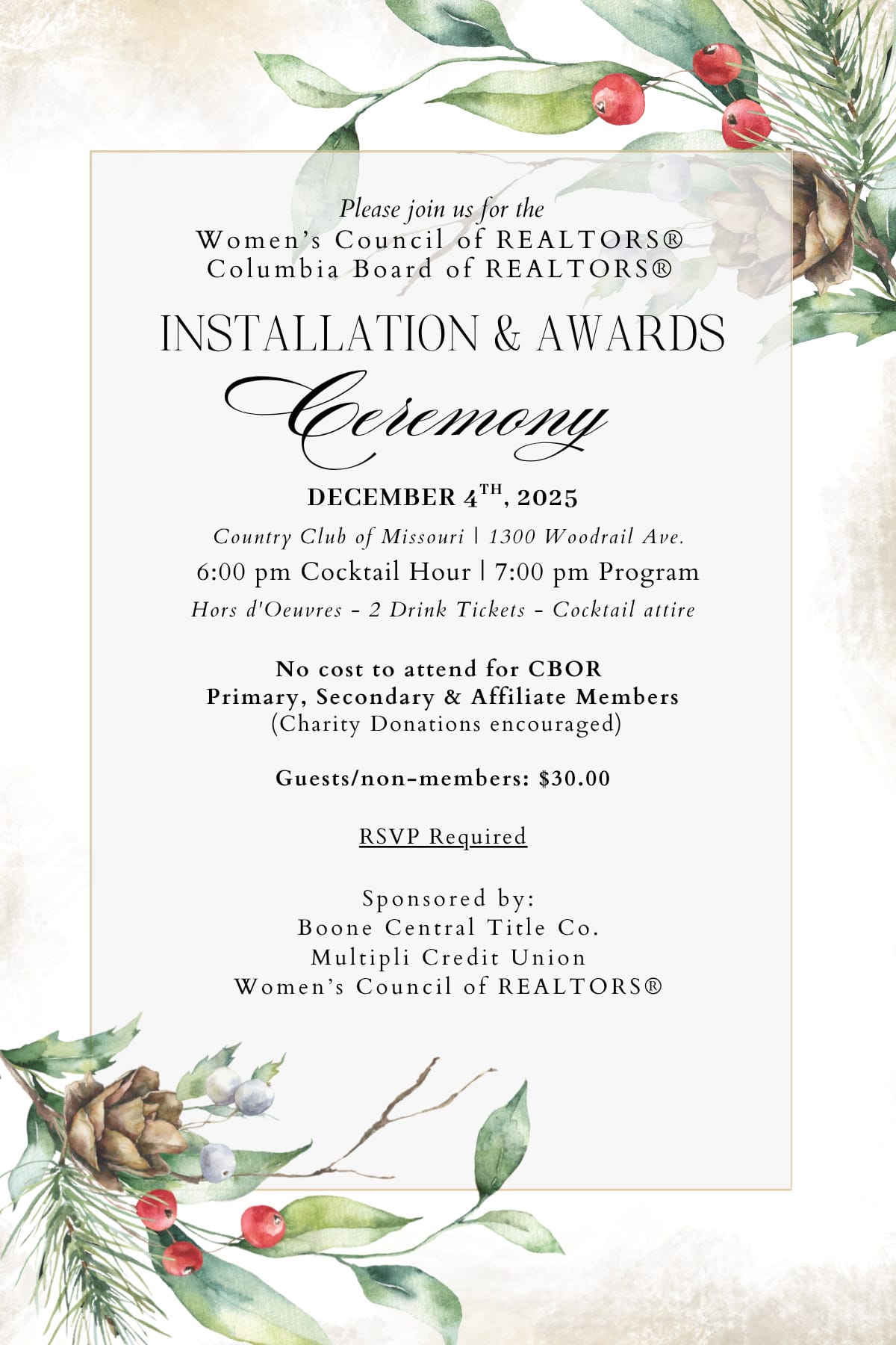 WELCOME TO THE Columbia Board of REALTORS® Join Login Events Affiliate DirectoryThe Columbia Board of REALTORS® is a streamlined, effective organization that significantly enhances member success by providing tools, training and techniques to enhance member profitability, productivity, and professional growth. Resources Search for Properties New Member Orientation Education Find a REALTOR® For the Public REALTOR® Love Mark Your Calendar Register Here Upcoming Events View Event Calendar